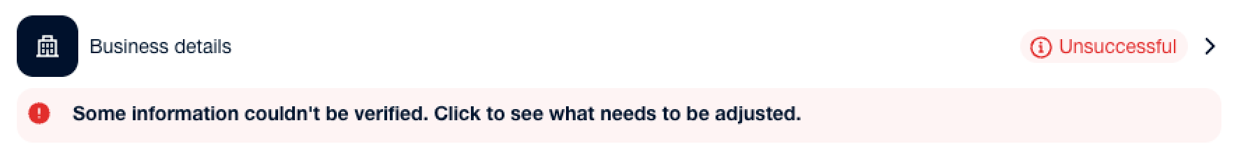 If your verification failed, you’ll also see a callout banner in the Business details section. Select this prompt to proceed.