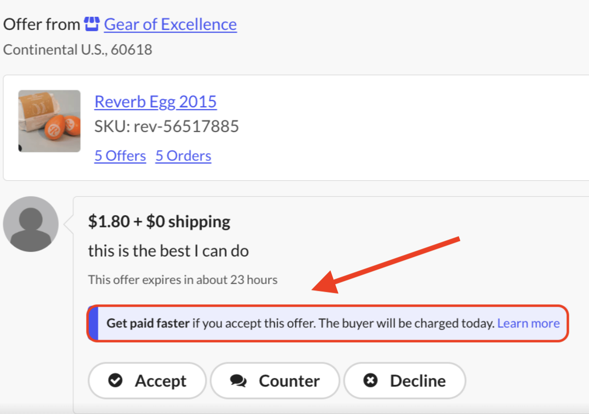 If you accept the offer and the buyer’s payment is successful, an order will be created on your Orders page. If the buyer’s payment can’t be processed, you will be notified and the buyer will have 24 hours to try again. Your listing will remain off the market during this time. If the buyer is unable to pay during the 24 hour period, your item will automatically be relisted on Reverb.