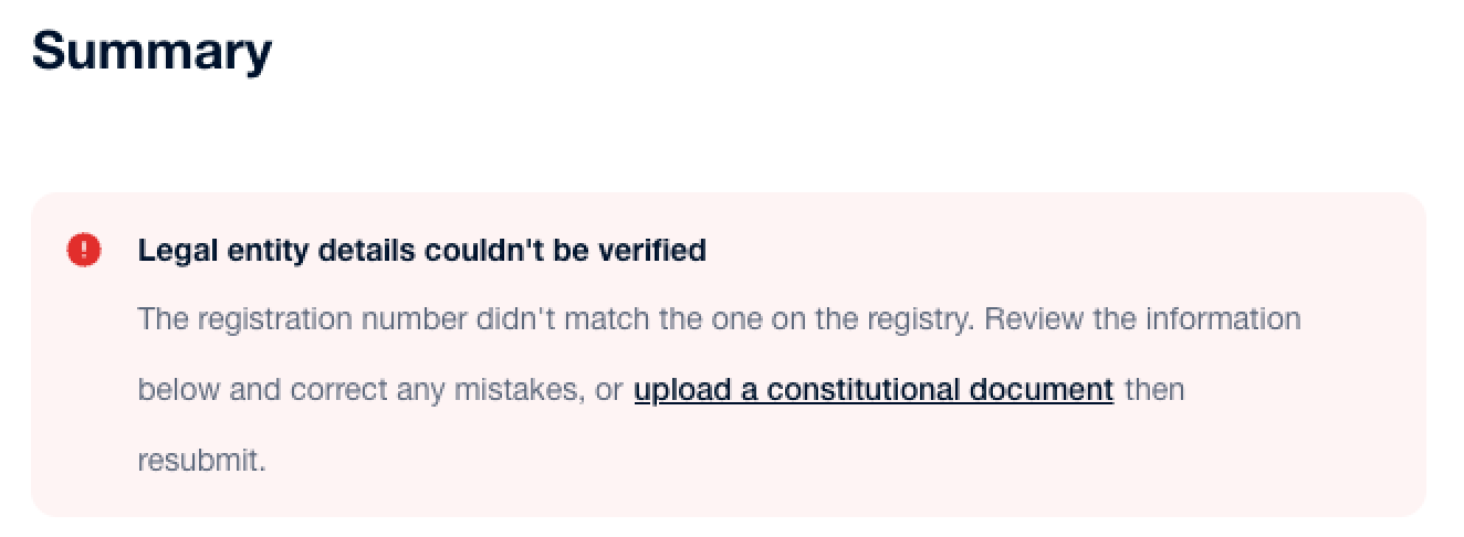 Se la verifica non è andata a buon fine, vedrai anche un banner di avviso nella sezione Dettagli aziendali. Seleziona questo avviso per procedere.
