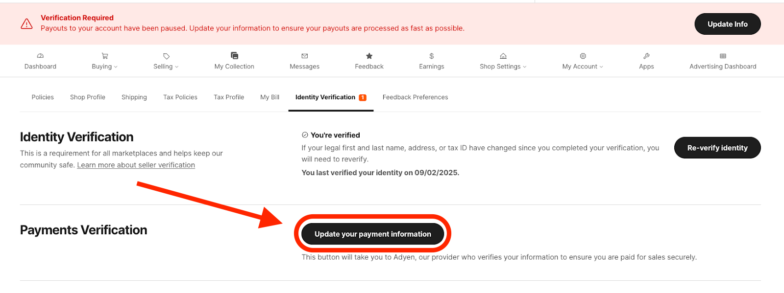 Una volta arrivato alla pagina Verifica identità, seleziona il pulsante Aggiorna i dati di pagamento.